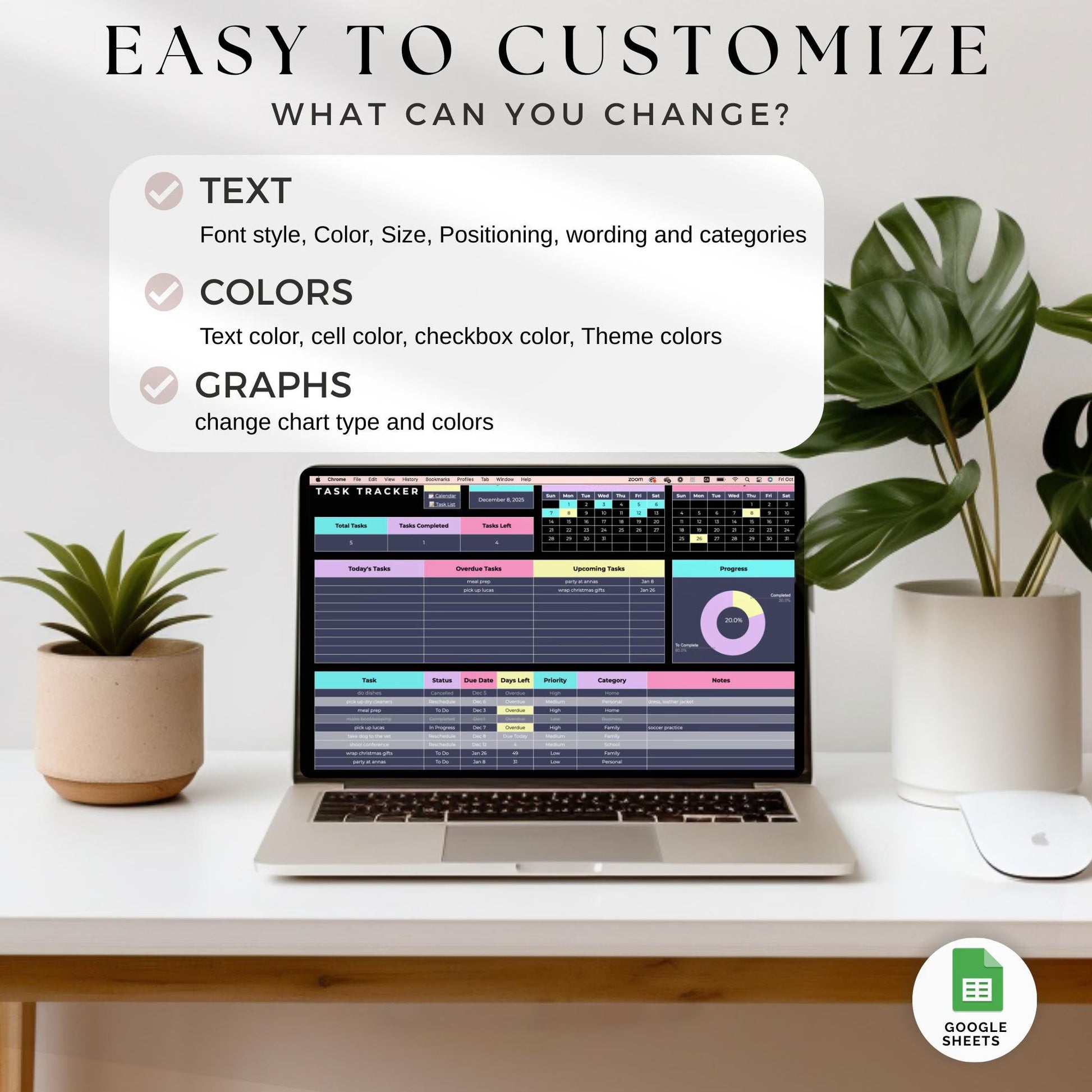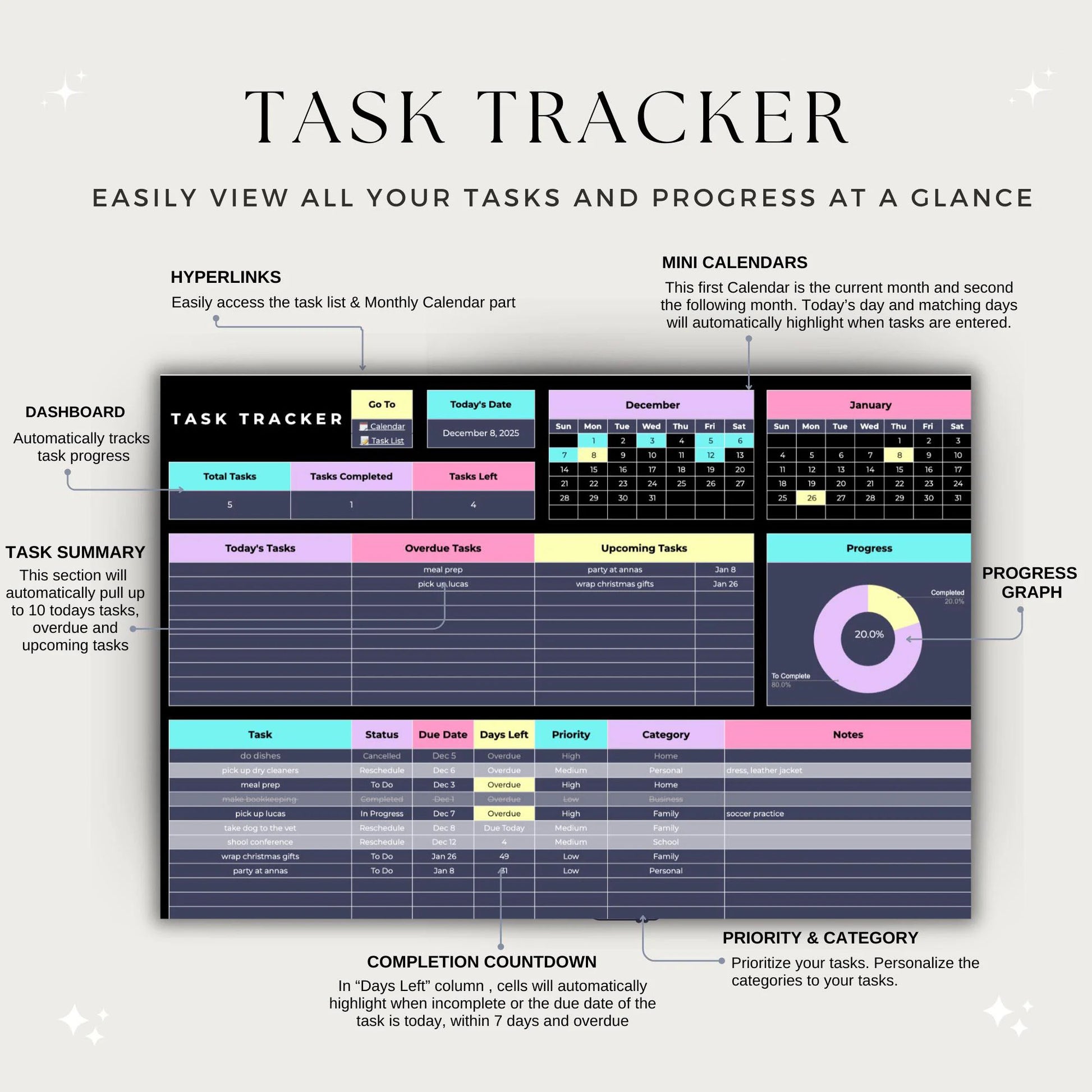 - Streamline your daily life with this all-in-one digital task management system. This Task Tracker automatically organizes your tasks, tracks your progress, and highlights upcoming or overdue items—so you never miss a deadline again. The built-in Smart Calendar automatically pulls tasks from your list and updates as you add, edit, or filter entries. Choose any year, month, or weekly start day, and watch your calendar populate instantly. With priority tags, category filters, dashboards, and mini calendars, this planner gives you a clear, at-a-glance view of everything you need to get done. Perfect for personal use, home management, business tasks, school planning, and more!